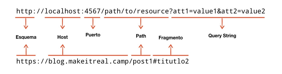La siguiente imagen muestra las partes de un URL utilizando dos ejemplos: